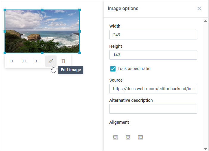 Для редактирования изображения открывается панель в правой части текстового редактора. В ней можно задать ширину и высоту изображения, зафиксировать соотношение сторон для пропорционального масштабирования, указать источник изображения, добавить описание и применить выравнивание.