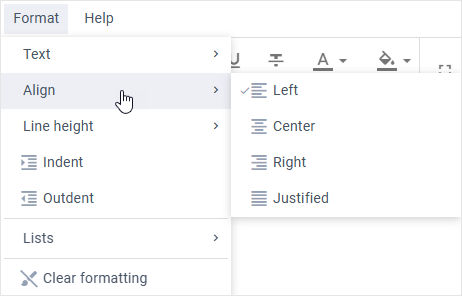 элементы управления выравниванием контента: по левому краю, по центру, по правому краю и по ширине;